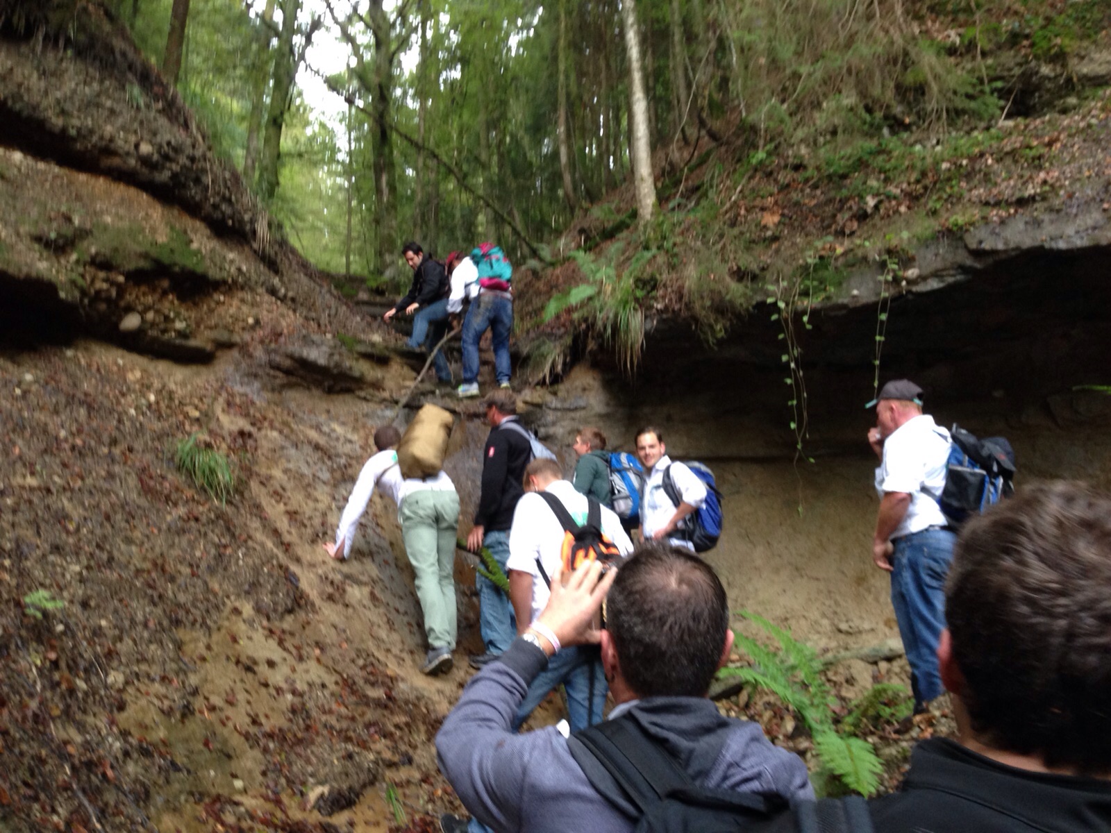 Das "Buure-Zmorge" am Sonntagmorgen mussten wir uns ziemlich verdienen. Da wir der Meinung waren, es gäbe da doch noch eine Abkürzung auf dem Weg dahin, mussten wir auf einmal, auf allen vieren den Hügel hinauf klettern. Aber wir gehen ja bekanntlich gerne steil und haben noch jede Steigung gemeistert.
